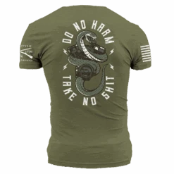 Look sharp and stay true to your beliefs with this men’s military green colored tee. Featuring a “do no harm, but take no sh!t” mantra and modern mechanic design, this lightweight t-shirt is perfect for making a bold statement. Make a powerful impact and represent your values with this tee.