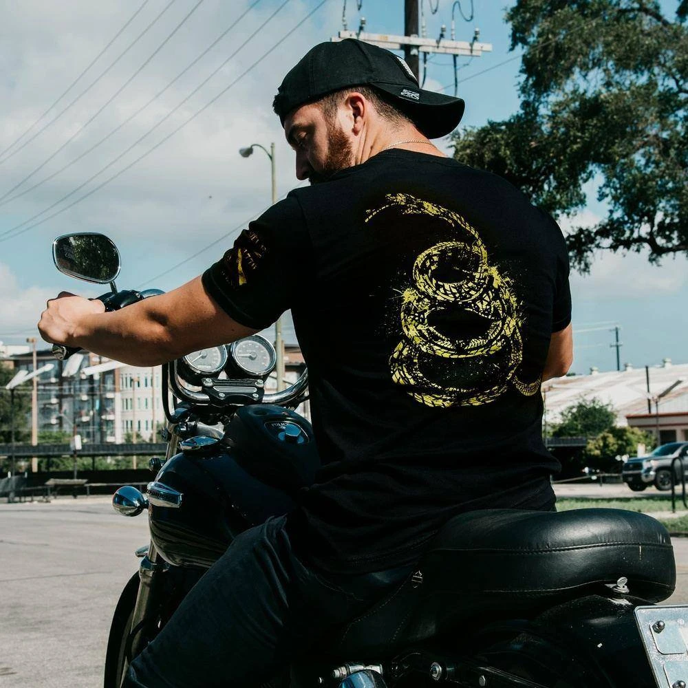 The shirt features a coiled rattlesnake, which is a historic symbol of American patriotism. The snake is tongue flicked, fangs out, and body coiled in defense, which warns “If you dare put your foot down on me, I will strike.” This shirt is perfect for anyone who wants to show their support for America and its values. Get your Don’t Tread On Me T-shirt today!