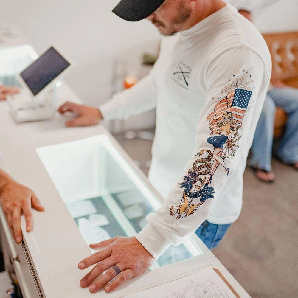 Look badass and feel ultra comfortable in this Men’s Nautical Pinup Long Sleeve! Featuring a patriotic pinup girl, it’ll have you feeling as cool as you look! Crafted from high-quality cotton, you’ll look stylish and feel great all day long! Capture your badass, patriotic side and make a statement with this must-have tee!