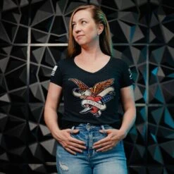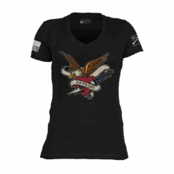 A patriotic shirt for women that is designed for the true American Patriot! Show your undying love of the stars and stripes with this Women’s Patriot Ink V-Neck. It features a classic vintage tattoo graphic displaying a bald eagle and your love for America. This stylish and comfortable v-neck will have you looking and feeling great! Show your patriotism in style in patriotic clothes for women!